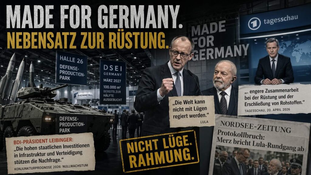 Die Tagesschau vom 20. April 2026 hat der Hannover-Messe Zeit gewidmet. Präsident Lula aus Brasilien war zu sehen, das Mercosur-Freihandelsabkommen wurde als „erhoffter Schub für die Wirtschaft in unsicheren Zeiten“ gefeiert, Bundeskanzler Merz durfte erklären, Deutschland wolle „ein netzstarker und gleichgesinnter Partner“ sein. Und es fiel dieser Satz: „Bei den Regierungsgesprächen am Nachmittag vereinbaren Brasilien und Deutschland eine engere Zusammenarbeit bei der Rüstung und der Erschließung von Rohstoffen.“